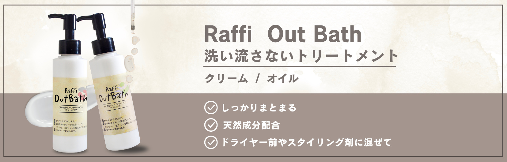 天然由来成分をたっぷり配合し、あなたの髪質、お悩みに 合わせてお選び頂ける洗い流さないトリートメントです。 髪のプロ美容師が開発したノンシリコンアウトバストリートメント。 クリームタイプとオイルタイプをご用意しております。