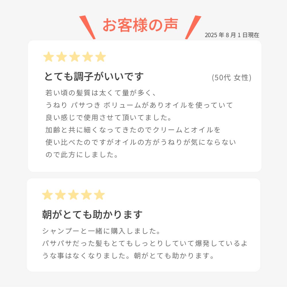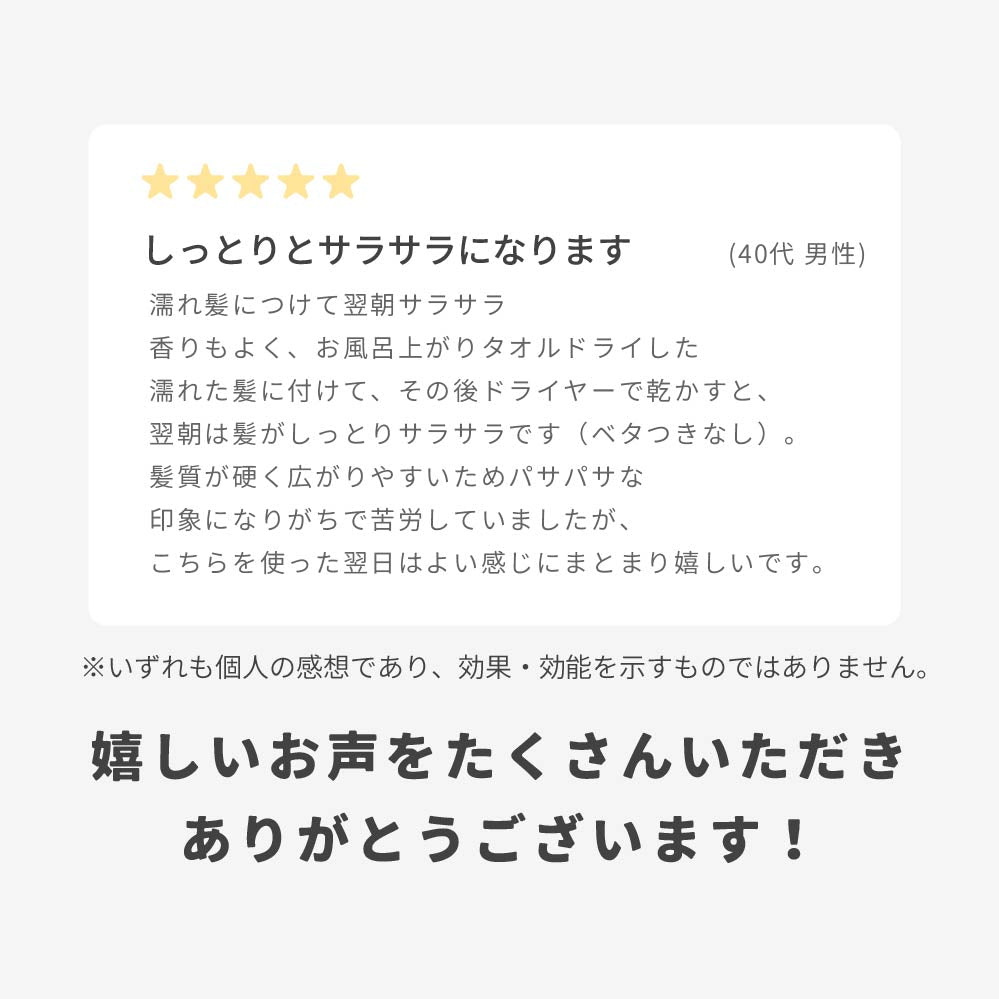 軽いテクスチャーが髪にスッとなじみ、重くならずに自然なツヤを与え、毛先までスルンとまとまる指通りを叶えます。