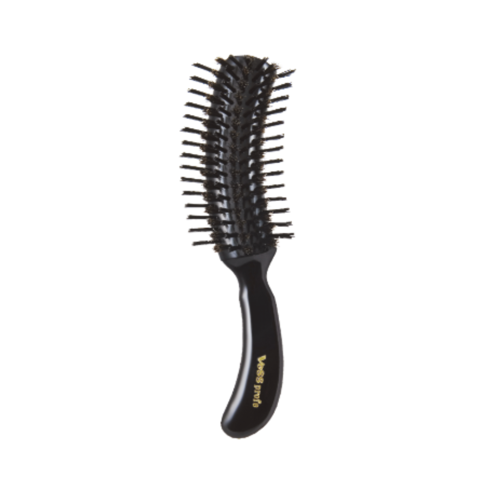 頭皮にやさしい先丸加工を施したナイロン毛と、髪にツヤを与える豚毛を行ごとに植毛したブラッシングブラシです。S型ハンドルが手に馴染みやすく、らくにブラッシングができます。